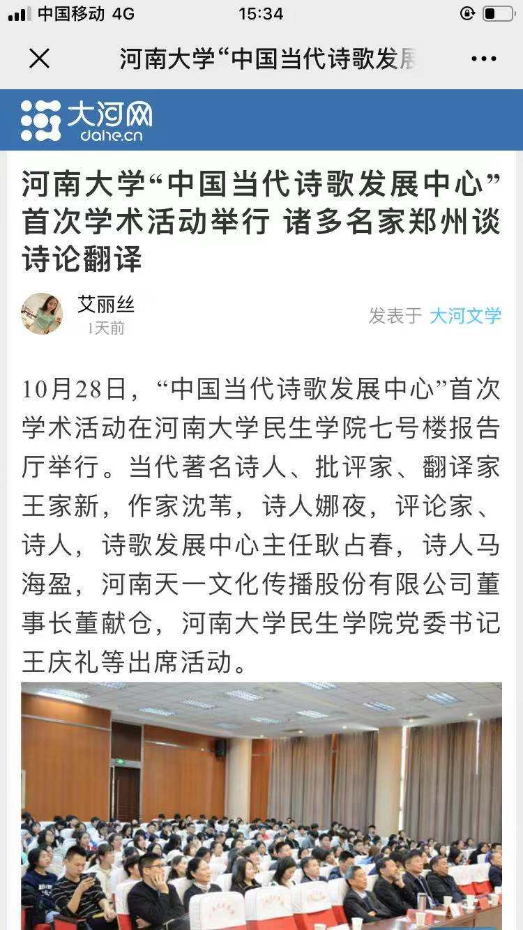自成立以来,中心已举办诸如“新时代•新境界•新诗意”、“送春天一首诗”、“2024当代文学颁奖盛典之2023年度中国长篇小说综评报告会”等系列大型诗歌论坛和诗歌朗诵会活动20余场,邀请了食指、多多、沈苇、王家新、龚雪敏、韩春燕、胡弦、张桃洲、耿占春、黄灯、李清源、李成等40余位全国著名诗人、作家和诗歌评论家进校讲学,在社会各界形成了广泛、深刻的影响力,相关活动在中国诗歌网、作家网、中诗在线、诗歌中国、诗歌周刊、大河网、大河报、猛犸新闻、顶端新闻等多家媒体上纷纷亮相,好评如潮。
